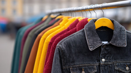 A vibrant display of stylish clothing on a rack in an outdoor market, featuring various textures and colors, perfect for fashion enthusiasts seeking inspiration.