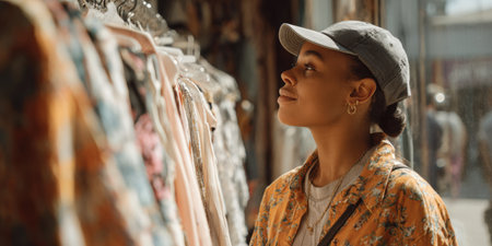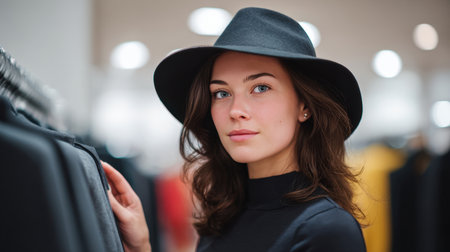 A young woman wearing a fashionable black hat gazes thoughtfully while shopping for trendy clothes in a vibrant retail environment, showcasing style and confidence.