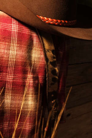 Cowboy in denim jeans and belt buckle standing in a rustic outdoor environment