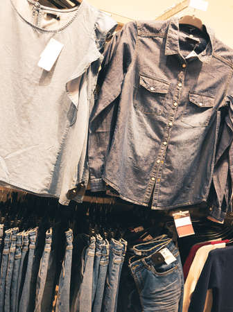 denim jeans and shirts in clothes store