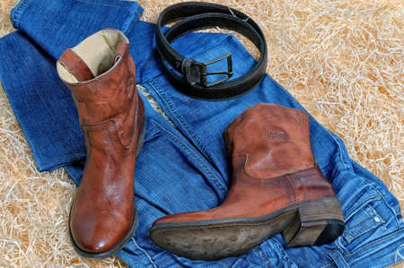 Pair of traditional brown leather cowboy boots and blue jeans and leather brown belt curtailed into a ring on straw