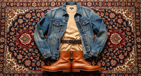 A stylish outfit consisting of a denim jacket, beige satin shirt, brown leather boots, and a black belt is laid out on a vintage patterned rug, showcasing a blend of casual and elegant elements.
