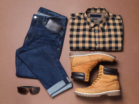 Flat lay composition with stylish men's clothes and boots on brown background