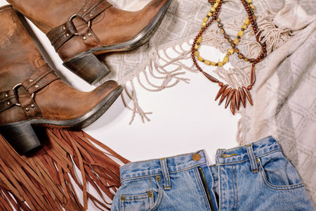 Boho Style. Leather Boots, Wooden Necklace, Denim Shorts and Hippie Bag with Fringe on White Background. Overhead View of Woman's Casual Day Outfits. Trendy Hipster Look.