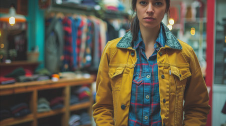 Stylish young woman wearing a yellow jacket and plaid shirt stands in a retro clothing shop with a thoughtful expression.