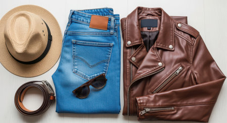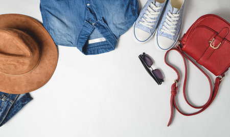 Women's fashion clothing and accessories. Jeans, denim shirt, sneakers, felt hat, leather bag, sunglasses, layout on a white background. Top view, flat lay, copy space