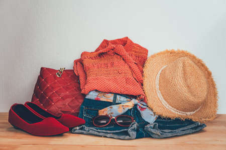 Dress Accessories women Jeans and hats sunglasses shoes on a white background.