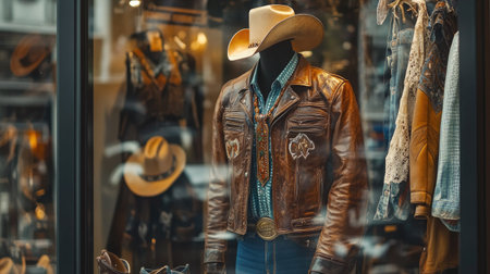 A stylish western-themed outfit on display in a boutique window, featuring a leather jacket, bolo tie, and cowboy boots.