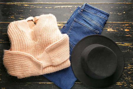 Warm clothes on wooden background