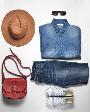 Women's fashion clothing and accessories. Jeans, denim shirt, sneakers, felt hat, leather bag, sunglasses, layout on a white background. Top view, flat lay