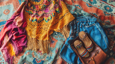 A lively arrangement of bohemian fashion highlights a colorful knit top, denim shorts, and stylish sandals, beautifully displayed on a textured rug, showcasing artistic flair and vibrant culture.