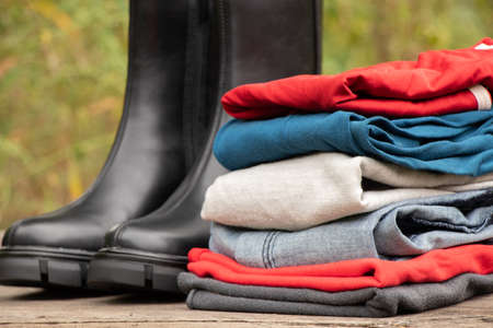 women's high black boots with thick soles and a pile of things stand on a wooden board in the sun on the street, women's shoes and winter clothes, fashionable clothes and shoes, things