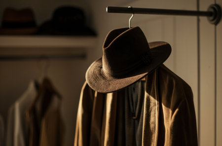 styled wardrobe in dark room with brown hat.
