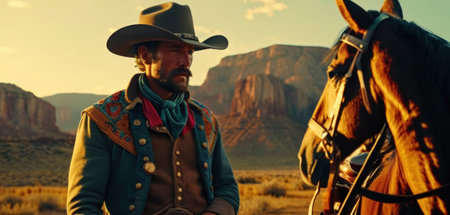 Typical Cowboy Portrait, Wild West Bandit in Traditional Stetson Hat and Shawl, Cowboy Flat Color Image, AI Generative illustration