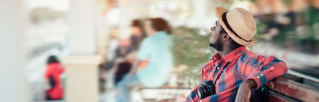 African male traveler with hat and sunglasses waiting for the train on railway station.Adventure travel concept