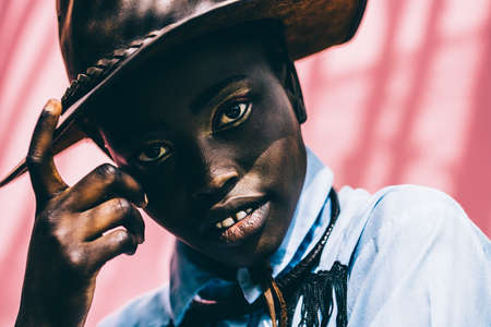 Masculinity and brutality concept. Archetypal image of Americans abroad. Cowboy life came to be highly romanticized. Adopt cowboy mannerisms as a fashion pose. Man unshaven cowboy black background