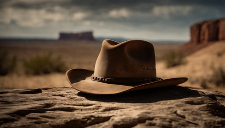 Detailed leather cowboy hat with decorative band resting on a rustic wooden surface