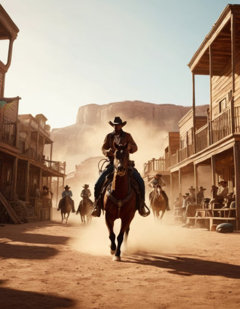 Silhouette of Cowboy Riding into the Sunset in a Dusty Western Scene