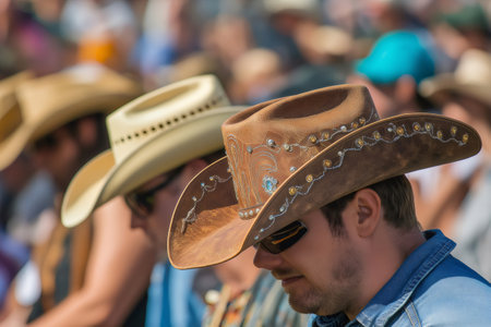 Cowboy wearing sunglasses and decorated hat enjoying country music festival with crowd in background