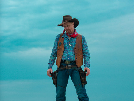 Cowboy stands in a dusty western town under a bright sky during the afternoon