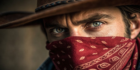 A rugged cowboy gazes intently, his scarf partially covering his face under a wide-brimmed hat.