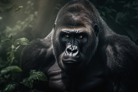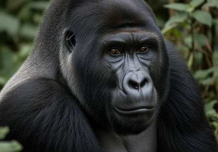 Close-up portrait of a powerful gorilla in its lush rainforest habitat.