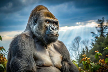 A powerful gorilla gazes intensely revealing its wise and emotional nature in the fading light.