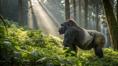 Majestic Silverback Gorilla in Sunlit Jungle Clearing - Wildlife and Nature Photography