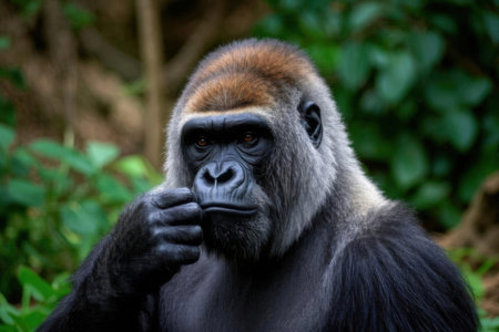 Contemplative gorilla portrait in jungle setting with lush greenery