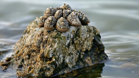 A close-up view of clusters of shells resting on a rock, surrounded by calm water, showcases the serene beauty of marine life at low tide.
