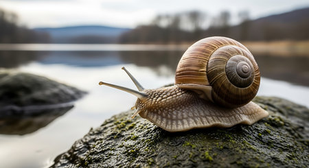 A curious snail makes its way across the wet asphalt, reflecting the beauty of nature on a rainy day, surrounded by glistening droplets.