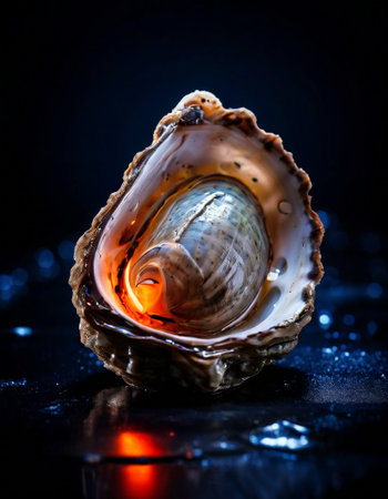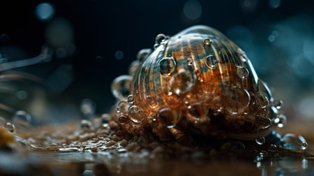 Close-up of a seashell with water droplets and bokeh effect, showing the intricate patterns and natural beauty of marine life.