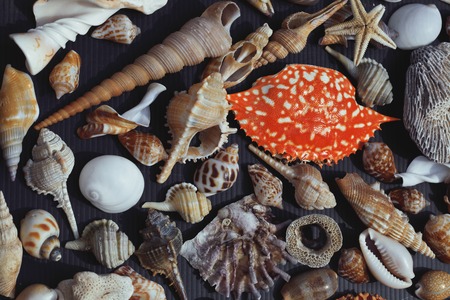 Sea shells on a dark old plank background
