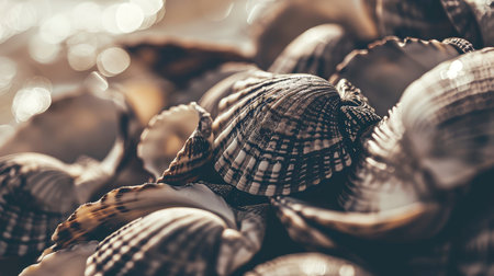 Closeup of a collection of seashells in sepia tone, perfect for natural textured backgrounds