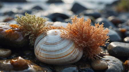 AI Generated. Striped shell and seaweed on wet rocks by shore