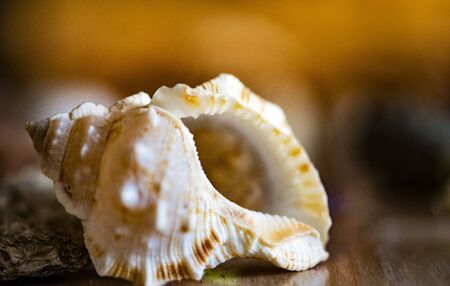 Close up of a sea shell on a wooden table. Top view.