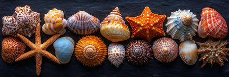 Collection of seashells displayed in a visually appealing manner, highlighting unique shapes and colors from different coastal areas, perfect for beach themed decor and marine art projects.