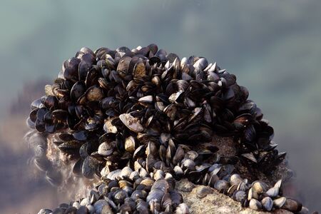 Mussels in their natural habitat. Colonies of mussels on the seashore. Food background.