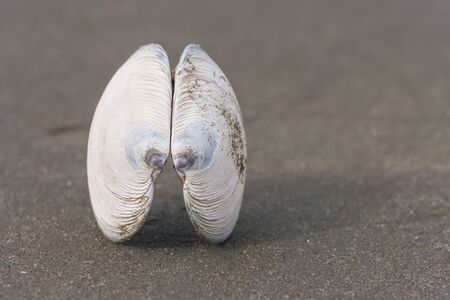 clam mussel shell is divided into two halves lies in the shape of an angel's wings on yellow sand on beach