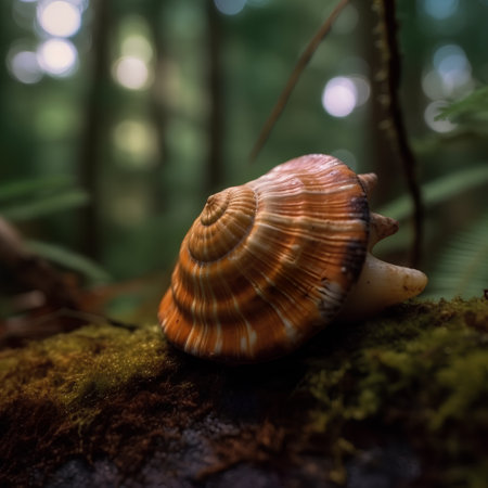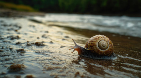 A detailed image presents a snail shell in close-up, revealing its spiral structure and textured surface. The shell displays a gradient of colors, ranging from beige to brown, and is backlit by a soft, warm light of the setting sun. Ideal for illustrating natural patterns or environmental themes and commercial use.