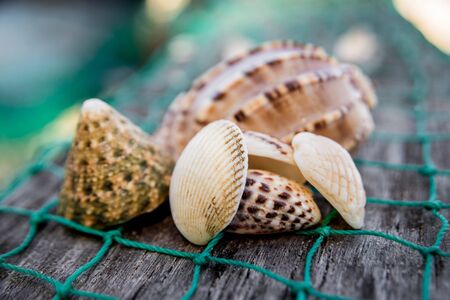 Sea shells with fishing net. Sea background.