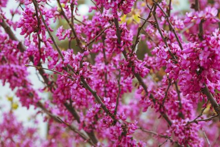 American Eastern Redbud Tree or Cercis canadensis blossoming in a park close up. Selective focus. Nature concept