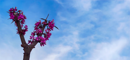 Branches with fresh pink flowers in the morning sunlight against the blue sky. Judas tree