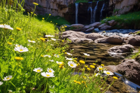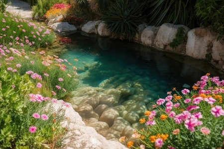 a hot spring surrounded by wildflowers and rugged boulders, created with generative ai