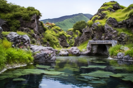 vegetation-covered rocks surrounding a serene hot spring, created with generative ai