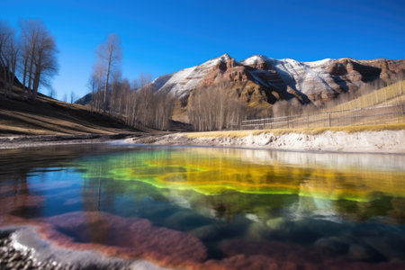 rainbow reflects off surface of an iron-rich hot spring, created with generative ai
