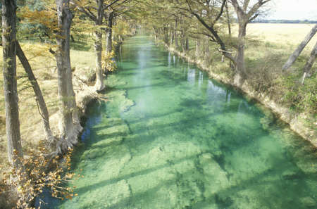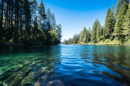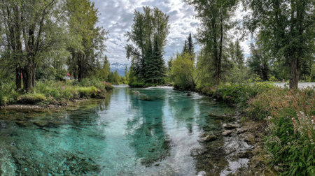 A vibrant river with clear water flows through a forest landscape. The image features lush green trees and vegetation lining the riverbanks. The composition showcases natural light and a cloudy sky, suggesting an outdoor environment. This visual is suitable for various commercial or editorial applications.