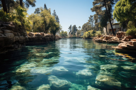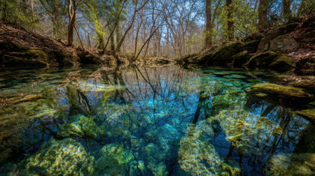 A serene landscape featuring clear spring waters reflecting trees and rocks, creating a tranquil outdoor scene ideal for relaxation and nature appreciation.