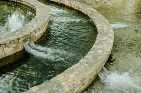 Landscape of a small waterfall in a circular fountain, group of small waterfalls, landscape in a rural park.