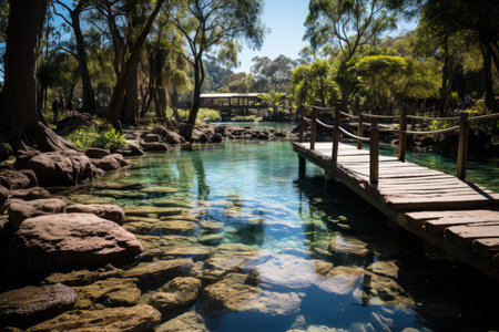 a small bridge across a steamy hot spring creek, created with generative ai